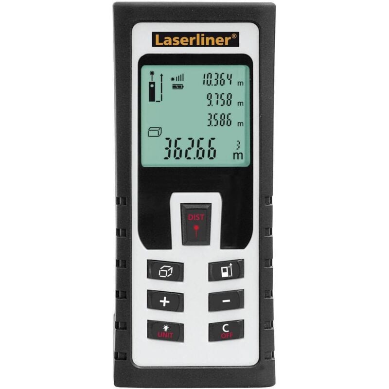 Telemetro laser DistanceMaster Display LCD Con 4 livelli espositivi commutabili (anteriore, posteriore, treppiede e perno) Con min./Max.Function per la determinazione delle distanze diagonali, orizzontali e verticali Precisione di misura (interna) ± 1,5 mm (precisione specifica dell'area, a seconda della distanza misurata) Determinare l'ambito spazio con la funzione di addizione e sottrazione Funzione superficie e volume, misura altezza con doppia funzione Pitagora Modalità di riferimento per il semplice trasferimento di lunghezze Con un collegamento treppiede opzionale Temperatura di lavoro von - 10 ° C a + 40 ° C consegna: include sacca di trasporto, punta di misura e batterie.