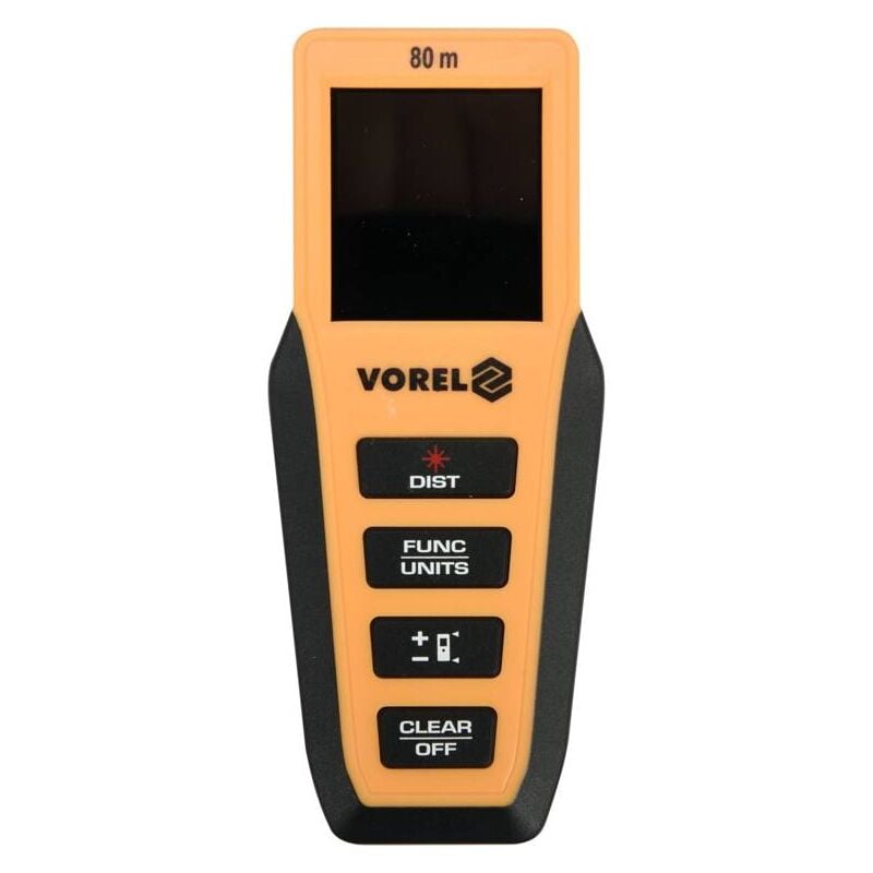 SPECIFICHE: Marchio: Vorel Simbolo: 81794 Serie: GR Dimensioni: 119 x 49 x 22 mm Laser: sì Classe laser: 2 Lunghezza d'onda laser: 635 nm Colore puntatore laser: rosso Intervallo di temperatura operativa: 0 ~ 40 ° C Temperatura di stoccaggio: - 10 ~ + 50 ° C Alimentazione: Batteria Tipo batteria: 2x1,5 V AAA Peso: 60 g Classe di protezione: IP54 Precisione di misura: ±2 mm Campo di misura: 0,05-80 m Tipo di display: LCD con retroilluminazione, quattro righe Unità di misura: metri, piedi, pollici, piedi + pollici Potenza laser: ? 1 mWFunzioni: il valore più alto della misurazione corrente (MAX), il valore più basso della misurazione corrente (MIN) Il valore più piccolo visualizzato: 1 mm Misurazione del volume: sì Misurazione dell'area: sì Modalità addizione e sottrazione della distanza: sì Modalità di misurazione singola: sì Modalità di misurazione continua: sì Modalità di misurazione indiretta con triangolo rettangolo: sì Modalità di misurazione indiretta con doppio triangolo