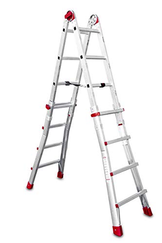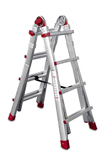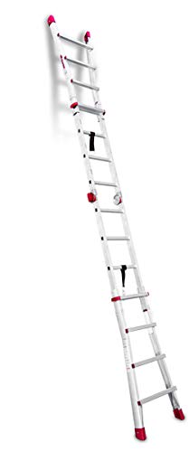 [TELES] Una scala telescopica in alluminio professionale che ne vale almeno 3! Numero gradini: 4 + 4 Portata 150 kg Altezza massima di lavoro: 4,20 m - max 4,70 m in posizione estesa 3,58 m - in posizione a forbice, con bracciolo di protezione
