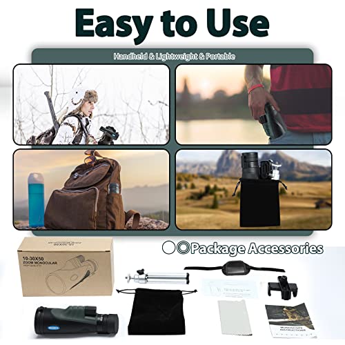 Telescopio Monoculare, 10-30X50 Zoom HD Monoculare, FMC BAK4 Prisma Telescopio Monoculare Ad Alta Potenza con Cinghia Portatile Adattatore Telefono per Bird Watching Caccia Campeggio (Green)