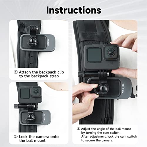 TELESIN Supporto a clip per tracolla per GoPro Hero 11, 10, 9, 8, 7, 6, 5, 4, Insta360 X3, DJI OSMO Action 3, YI, con rotazione a 360°, supporto per camma a sgancio rapido, accessori per action camera