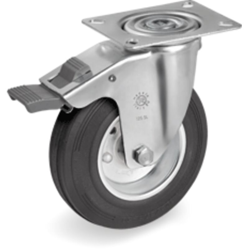 Codice: 8007554065242 Marca: TELLURE ROTA. Ruota gomma nera - Disco acciaio - Boccola Supporto superleggero girevole - Freno statico d. 80 h 109 kg 65 d.100 h 127 kg 80 d.125 h 153 kg 130