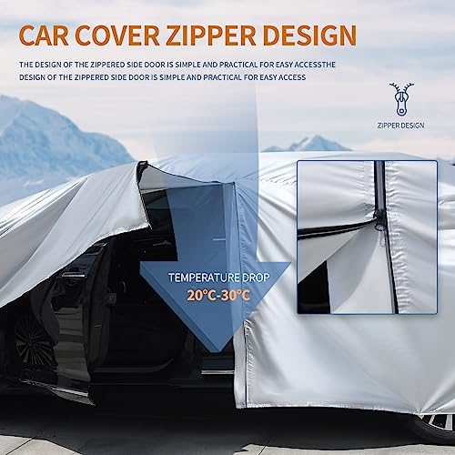Design umanizzato - le strisce riflettenti possono migliorare la sicurezza del parcheggio notturno e le cinture antivento anteriori e posteriori possono impedire che la copertura dell'auto venga spazzata via dal vento. Una cerniera sul sedile del conducente consente un facile ingresso e uscita senza dover rimuovere costantemente il cappuccio.