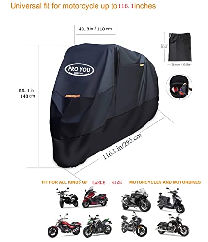Misura universale: la copertura per moto Pro You è realizzata in tessuto Oxford spesso 420D, copre perfettamente moto fino a 295 cm di lunghezza, come bici da tour, choppers e Cruiser. La confezione include: copertura per moto + custodia + manuale utente