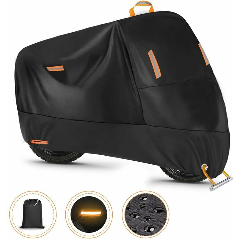 Lock Hole Design Foro di blocco antifurto per proteggere la copertura della tua moto dai furti. Il buco della serratura con un diametro di 4 cm può adattarsi a tutti i tipi di serrature per moto. Inoltre, il telo coprimoto è più antivento dopo il bloccaggio. Cinturino e fibbia per impieghi gravosi Fibbia antivento regolabile con fibbie a sgancio rapido per una migliore resistenza al vento Ciò può impedire che la copertura della motocicletta si pieghi e si allenti al vento. C'è un cordino elastico nella parte inferiore, che può adattarsi bene alla tua moto. Resistente all'acqua e alla polvere Con tessuto impermeabile al 100% per proteggere la moto da infiltrazioni d'acqua e vento. Metti la motocicletta all'esterno, la copertura della motocicletta può proteggerla dai danni causati da pioggia, foglie cadute, feci e neve. Concetto di design La sicurezza della motocicletta è fondamentale quando si parcheggia la motocicletta Soprattutto di notte, vogliamo anche evitare che veicoli e persone