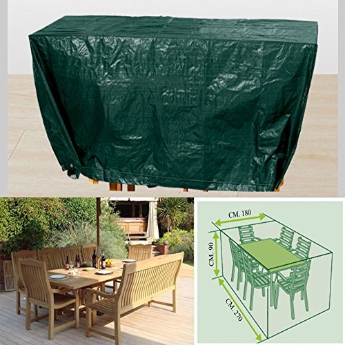 Telo sagomato di colore verde, atto a coprire tavoli rettangolari con o senza sedie. Provvisto di occhielli in alluminio alla base e corda di rinforzo per modellare la base del telo al mobile. Protegge dal deterioramento dovuto alle intemperie e polvere