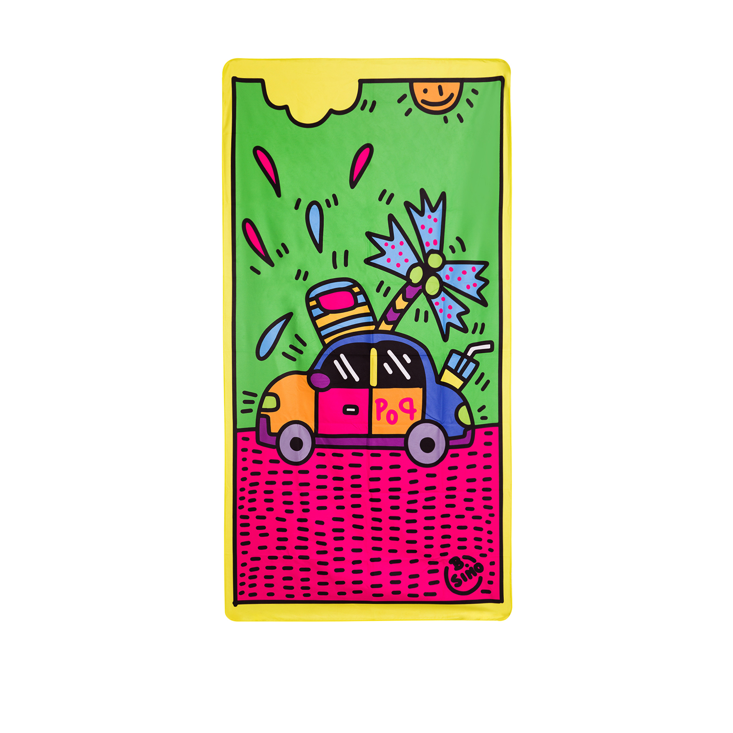 Aggiungi un po' di colore alle tue giornate di vacanza con questo allegro telo mare! La grafica è stata realizzata in esclusiva per dal tattoo e street artist Simone Bonetta, in arte B.Simo e raffigura un'auto in partenza per il mare! Quanto colore porterà sulla spiaggia: perfetto per prendere il sole a riva o per asciugarti dopo un bel tuffo al mare o in piscina. Un must have per l'estate! Grammatura: 150 gsm. Lavabile a 30° in lavatrice. Misure: 87x165 cm.