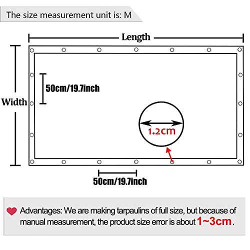 【Telone Étanche】 Realizzato in polietilene (PE) - 12mil/0.3mm addensato - 420g/㎡. Fascia per orli in tela cerata con 5 bordi di cucitura e angoli rinforzati per un sostegno stabile. Occhielli crittografati, con occhiello in metallo antiruggine ogni 50cm, il diametro dell'occhiello è di 1.2cm. Può anche essere fissato con una corda per una facile installazione e rimozione. Dimensioni multiple: le larghezze includono 2/3/4/5/6/7/8/9/10 m. Le lunghezze includono 3/4/5/6/7/8/9/10/11/12/13/14/15 m.