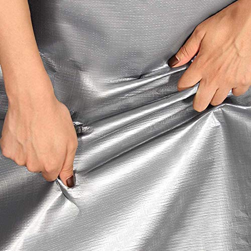 TELO COPERCHIO RESISTENTE E RESISTENTE IMPERMEABILE: film plastico PE wayerproof, resistente agli acidi e agli alcali, inodore. 160 g / m² 12,6 mil, telo in polietilene ad alta resistenza argento / verde spesso, tessuto e polietilene rivestito con cuciture termosaldate e corda nell'orlo, forma un riparo forte e durevole dalla luce solare, dalla pioggia e dalla polvere, soprattutto più fresco sotto quando fa caldo