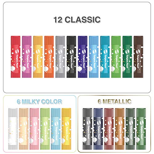 24 colori brillanti e vivaci: il set di 24 bastoncini lavabili a tempera include 12 colori classici vivaci, 6 colori lattiginosi e 6 colori metallici abbaglianti, vari colori tra cui i tuoi bambini possono scegliere e aiutare a sviluppare la loro creatività o selezioni di colori sui dipinti artistici