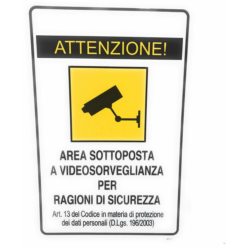 Cartello segnaletico in plastica, ottimo sia per uso interno che per uso esterno, che riporta la scritta “Attenzione! Area sottoposta a videosorveglianza per ragioni di sicurezza - art. 13 del codice in materia di protezione dei dati personali (d.lgs. 196/2003). Questo prodotto viene fornito senza istruzioni, il colore è bianco e giallo, le dimensioni sono circa 30 x 20 cm, il peso è di circa 30 gr ed il riferimento normativo è solo per deterrenza.