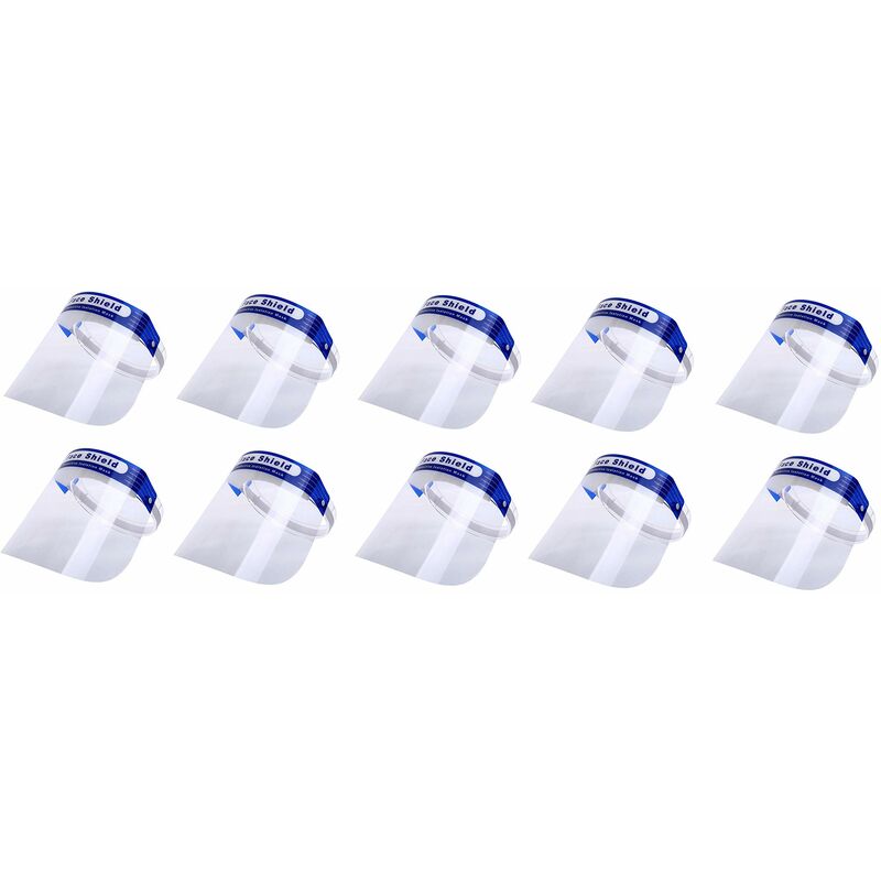 Dieci maschere facciali di alta qualità con elevata resistenza agli urti, permettono infatti di restare protetti da vari rischi come detriti volanti, schizzi di sostanze chimiche, o schizzi di saliva o starnuti. Previa disinfezione possono essere riutilizzate dopo l'uso tutte le volte che si vuole, si tratta di un modello semplice, economico e leggerissimo, che può anche essere regolato e pertanto è adatto sia ad adulti che a bambini ed utilizzabile anche con occhiali da vista. Si presenta senza confezione, provvisto di semplici istruzioni in inglese e di una spugnetta da posizionare sulla fronte. Le dimensioni sono di circa 32 x 22 x 0,1 cm, la spugnetta è alta circa 3 cm, il peso è di circa 40 gr, l'estetica ed il colore possono variare secondo disponibilità di magazzino.
