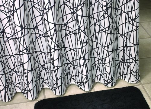 Tenda Doccia Tessuto ~ Motivo: Linee croce e orizzontale ~ Colore: nero e bianco ~ Massa: 180 x 230 cm ~ 100% Poliestere ~ con Elastico ~ Senza Anelli Per Tenda Doccia