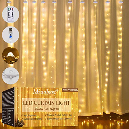 【Specifica】 3Mx3M, luci per tende fatate con 300 LED, migliora le tue decorazioni squisite, filo principale 3M, 10 corde a goccia. Il controller ha la funzione di memoria, che potrebbe essere ripristinata dalla modalità di impostazione precedente al riavvio. Il filo di rame Mroobest Curtain String Lights è super sottile ma robusto, impermeabile e isolato;