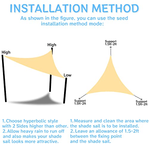 【Facile da installare】: La vela ombreggiante ha un anello a D in acciaio inossidabile all'estremità di ogni angolo per appenderla facilmente, una corda aggiuntiva aiuta con il fissaggio e l'installazione della vela ombreggiante. Design del bordo concavo del triangolo della vela ombreggiante per una migliore espansione, la cucitura del prodotto punta a terra, si consiglia di installare l'inclinazione dell'angolo 20-40 per consentire il drenaggio dell'acqua.