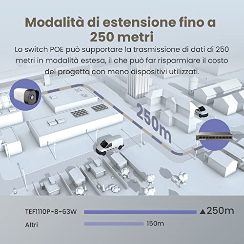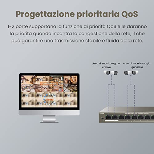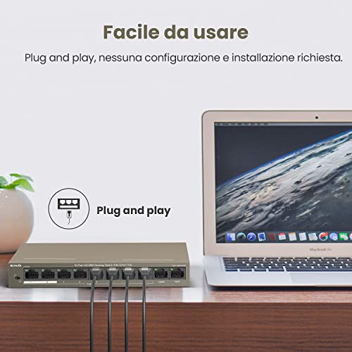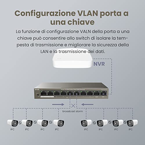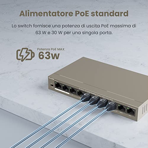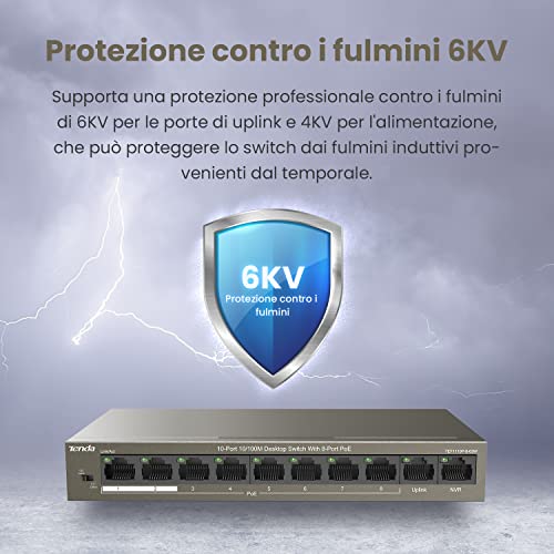 Tenda PoE Switch Ethernet 10 Porte 10/100 Mbps, QoS, One-key VLAN, 8 Porte PoE, 2 Porte (Uplink&NVR), IEEE 802.3af/at, 63W, Nessuna Configurazione Richiesta, Cassa in Metallo TEF1110P-8-63W
