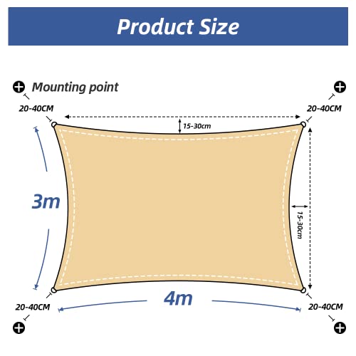 【Nota sulle dimensioni】 Poiché la forma della vela ombreggiante non è un rettangolo standard, la dimensione del prodotto (ad esempio, 3x4m/2x3m) si riferisce alla lunghezza laterale della vela ombreggiante piuttosto che alle dimensioni dell'area di pratica. Il pacchetto include: 1 * vela ombreggiante, 4 * clip, 4 * corde (ciascuna 1,35 m) e 1 * custodia.***Ci sono alcuni pezzi di filo durante la cucitura, che è un fenomeno normale dovuto alla