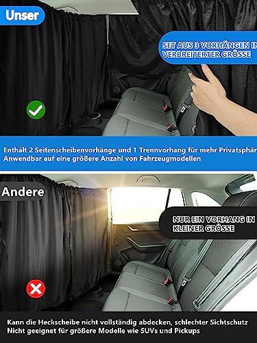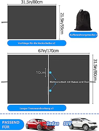 Adatto per diverse auto: la dimensione della nostra lunga tenda divisoria è: 170 x 80 cm, e la dimensione delle due tende per lunotto posteriore è: 80 x 55 cm. La dimensione della nostra tenda frangivista per auto è più ampia, più grande delle normali tende sul mercato e può essere adattata a una vasta gamma di berlina, SUV, pickup camion e altri modelli.