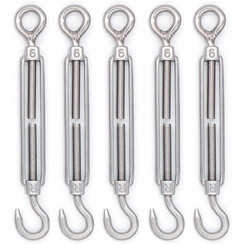 Materiale: realizzato in acciaio inossidabile 304 di alta qualità, resistente alla ruggine e durevole. Dimensioni: M5 Contenuto della confezione: 5 ganci tendifilo tenditore. Ampia applicazione: ideale per regolare la tensione o la lunghezza di cavi, funi, tiranti e altri sistemi di tensionamento. Ampiamente applicato per usi interni ed esterni. Facile da usare: basta ruotarlo per regolare la tensione quando lo si utilizza in cavi di stendibiancheria, catene e ringhiere o qualsiasi altra applicazione.