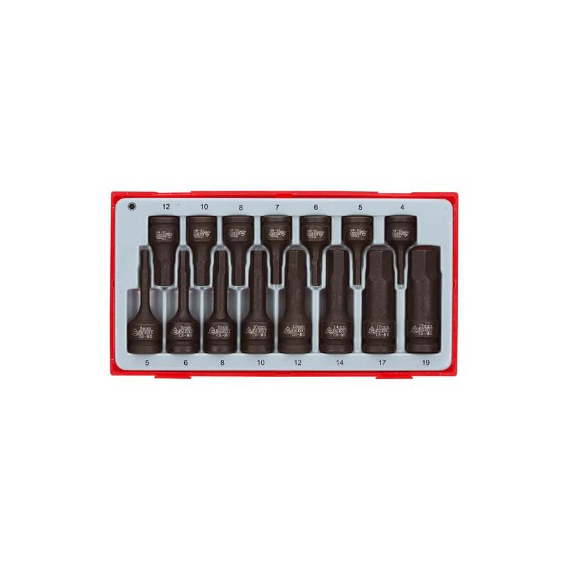 Set di 15 bussole a impatto da 3/8" e 1/2" con punta esagonale. p align="LEFT">Bussole da 3/ 8” 4, 5, 6, 7, 8, 10, 12 mmp>Prese da 1/2” 5, 6, 8, 10, 12, 14, 17, 19 mm< /p>