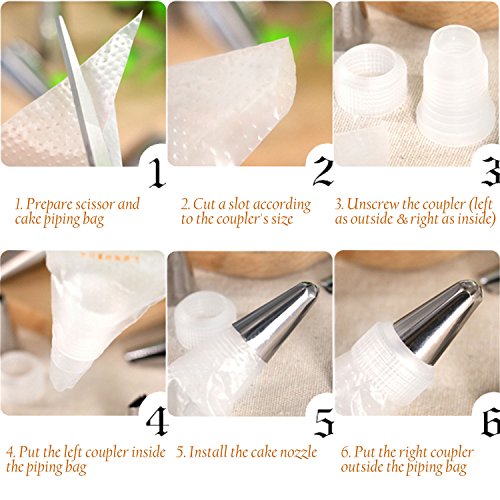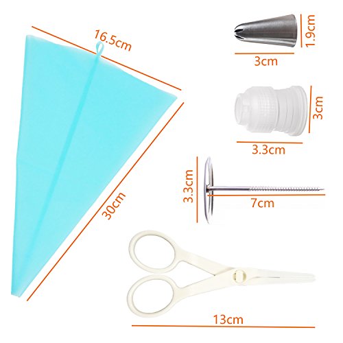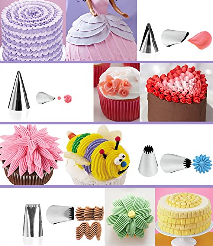 Pezzi Bocchette Decorative Include Tutti gli Accessori Necessari: 35 punte, 2 tasche da pasticciere riutilizzabili, 10 tasche usa e getta, 2 accoppiatori, 1 Spazzola di pulizia, 1 Forbice da fiore di torta, 2 chiodi di fiori, 4 stampini in silicone per cupcake e una custodia.