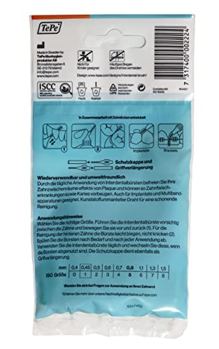 Articolo consegnato: 3 conf. x 8 TePe Scovolini interdentali Originali con cappuccio, misura ISO 1 (filo 0,45 mm), sottile, colore arancione, alta qualità, Made in Svezia