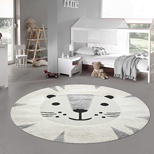 Teppich-Traum Tappeto Cameretta Bambino Asilo Nido da Gioco Playmat 3d pelo alto e basso Motivo Gatto crema grigio bianco, 200 cm rotondo
