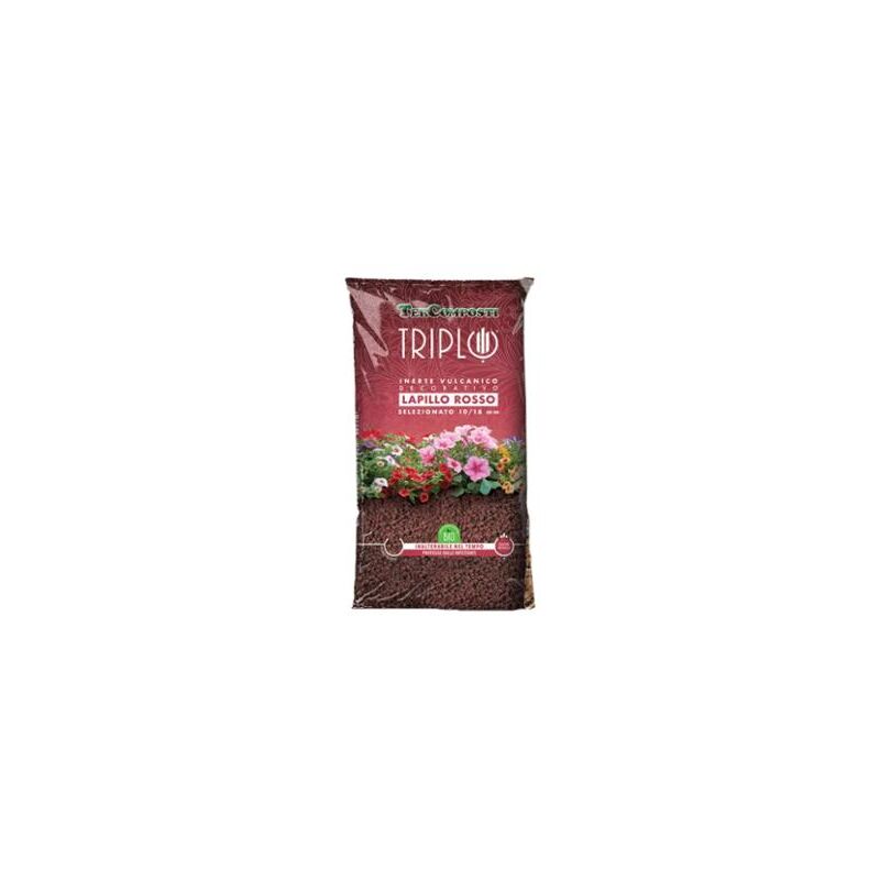 TRIPLO LAPILLO ROSSO, è un minerale magmatico effusivo, macinato e accuratamente vagliato, isolante e leggero, da 10/18mm. E' un prodotto naturale, consentito in agricoltura biologica, il suo colore rosso e la sua alta resistenza alle intemperie, lo rendono un ottimo prodotto pacciamante e decorativo, inalterabile nel tempo. E' ideale per la realizzazione di aiuole, giardini rocciosi e decorazione