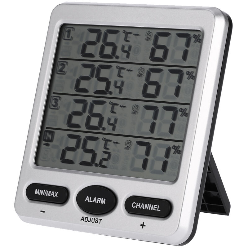 Multi-funzionale LCD termo-igrometro porta molta convenienza per la vostra vita quotidiana. Con questo prodotto, è possibile conoscere la temperatura interna / esterna e umidità dal ricevitore interno facilmente. Caratteristiche: Può misurare la temperatura interna ed esterna e umidità. 433MHz frequenza di trasmissione, si può conoscere la temperatura esterna e umidità con ricevitore interna. Outdoor (CH 1,2,3) e al coperto temperatura / umidità HI / allarme basso. ° C / ° F unità di temperatura selezionabile. Min / Max record di temperatura e umidità. Temperatura e umidità calibrazione manuale. indicazione della temperatura e le tendenze di umidità. Livello di comfort indicazione. Possono ricevere fino a 8 sensori. Con dip switch da impostare e risolvere 1-8 canali. funzione di ricerca a lungo dopo la comunicazione è persa. Condizione libera o impiccagione. Specifiche tecniche: Display: LCD Rilevamento della temperatura interna: 0 ~ 60 ° C / 32 ~ 140 ° F Misurazione della temperatura