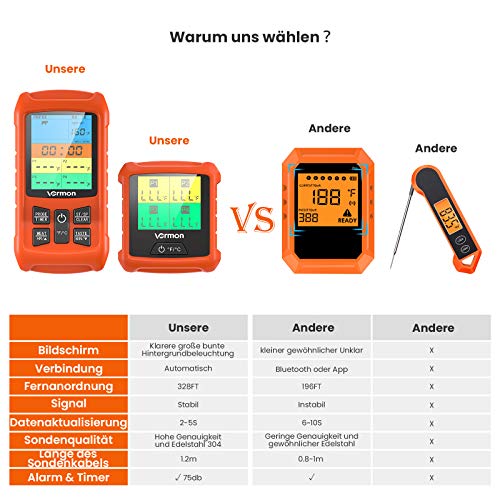 Timer e allarme: timer on/off regolabile fino a 23 ore, 59 m, 59 secondi, il ricevitore emette un segnale acustico più forte quando la temperatura del cibo raggiunge la temperatura programmata. La retroilluminazione LCD colorata e più grande offre una visione più chiara e può facilmente distinguere diversi tipi di carne.