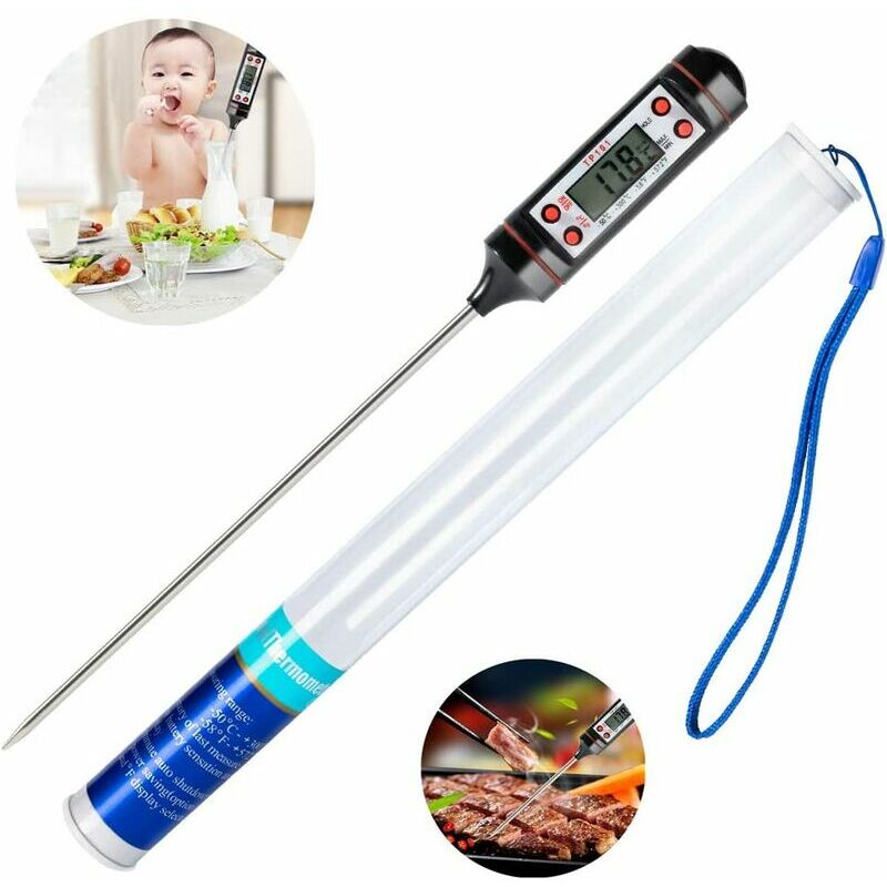 Facile da usare? Funzionamento veloce, non appena si preme il pulsante del termometro, misura la temperatura. Grazie al display digitale del termometro, puoi facilmente leggere la temperatura in 5 secondi. ?Tassatore super lungo? Il termometro per grill può essere utilizzato universalmente grazie alla sonda lunga 14,6 cm (lunghezza totale del termometro 22,8 cm), quindi è sufficiente inserire una sonda da 3-8 cm per ottenere risultati utili . Il diametro della sonda è di 3,5 mm. Viene fornito con un sacchetto di plastica per appenderlo e trasportarlo facilmente. ?Molte funzioni pratiche? È un buon termometro da cucina con visualizzazione della temperatura attuale, valore massimo e minimo, le variazioni di temperatura vengono registrate rapidamente. Funzione Hold per visualizzare permanentemente il valore misurato sullo schermo. La funzione HOLD del termometro da cucina è molto utile quando si misurano liquidi caldi. ?Intervallo di misurazione della temperatura? Regolabile in gradi C