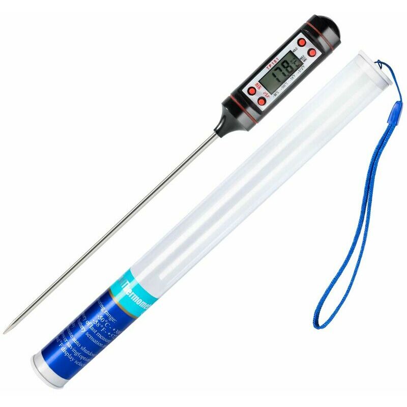 Facile da usare - Funzionamento rapido Dopo aver premuto il tasto "" "" su "" "" del termometro, viene misurata la temperatura. Grazie al display digitale del termometro, puoi facilmente leggere la temperatura in 5 secondi. 【Sonda super lunga】 Il termometro per barbecue può essere utilizzato universalmente grazie alla sonda lunga 14,6 cm (lunghezza totale del termometro 22,8 cm). Quindi puoi semplicemente inserire una sonda da 3-8 cm per ottenere risultati utili. Il diametro della sonda è di 3,5 mm. Viene fornito con un sacchetto di plastica per appenderlo e trasportarlo facilmente. 【Molte funzioni pratiche】 È un buon termometro da cucina con visualizzazione della temperatura attuale, valore massimo e minimo. Le variazioni di temperatura vengono registrate rapidamente. Tenere premuta la funzione per visualizzare permanentemente il valore misurato sullo schermo. La funzione HOLD del termometro da cucina è molto utile quando si misurano liquidi caldi. 【Intervallo di misurazione della