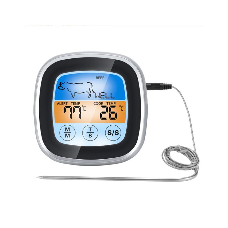 Allarme temperatura/Timer - Questo termometro da cucina ha una deliziosa guida alla temperatura integrata e un allarme di cottura intelligente. Se la temperatura o il tempo superano l'intervallo impostato, ti verrà ricordato quando il termometro per alimenti lampeggia ed emette un segnale acustico. [Alta precisione e resistenza al calore] Questo termometro da cucina può sopportare un calore di 0°C~250 ° C (32 ° F ~ 482 ° F) con una precisione di ± 1 ° C. La sonda può calcolare rapidamente e accuratamente la temperatura e impedire che venga misurata. Brucia le tue misurazioni. [Touchscreen LCD] L'ampio touchscreen LCD con retroilluminazione brillante fornisce letture della temperatura rapide e chiare da qualsiasi angolazione.Anche in condizioni di scarsa luminosità, il display retroilluminato è di facile lettura.< /p> [Applicazione] Questo termometro digitale per alimenti offre 8 tipi di carne, tra cui manzo, maiale, pesce, vitello, agnello, pollo, tacchino e hamburger.