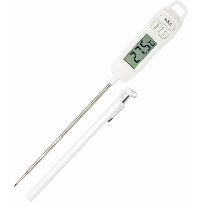 Facile da usare - Con la sua struttura a forma di penna e l'ampio display LCD di facile lettura, questo termometro è facile da usare. Accendi, imposta la temperatura in Celsius o Fahrenheit, inserisci delicatamente il termometro nel cibo o nella bevanda desiderata e leggi la temperatura in 5 minuti! Maggiori informazioni - Il termometro per alimenti funziona altrettanto bene per grigliare, torte, barbecue, produzione di caramelle e altro ancora. La sua pratica sonda in acciaio inossidabile è sufficientemente lunga da evitare di scottarsi le mani durante la misurazione della temperatura degli alimenti, garantendo così la completa sicurezza durante l'uso. Cottura migliorata - Grazie al nostro affidabile termometro, carni e polli scotti sono una cosa del passato, così come il pollame essiccato, ecc. Ottieni un piatto perfetto, il che rende la nostra sonda inestimabile per cucinare il pollame e altro ancora! Qualità premium - Realizzato in ABS e acciaio inossidabile di prima qualità, il