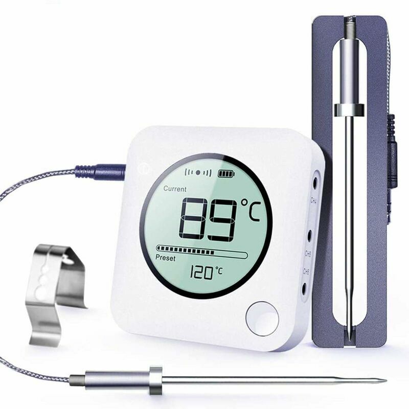 Semplifica la cottura - I dispositivi Bluetooth e le app gratuite funzionano perfettamente con il tuo telefono cellulare. Portata wireless: 60 m (esterno), 30 m (interno). Usa il tuo telefono cellulare per leggere la temperatura di cottura sempre e ovunque [Facile da usare e altamente preciso] Termometro per carne Bluetooth, intervallo di temperatura: da 0 °C a 300 °C, precisione di ±1 °C o percorso del fumo, puoi goderti il tuo tempo. [Temperatura preimpostata e informazioni in tempo reale] Otto griglie principali tra cui scegliere, con temperature preimpostate individualmente, timer e allarmi di temperatura per aiutarti a cucinare alla perfezione. [Ampio display LED di facile lettura] Termometro digitale wireless, ampio schermo, valore di temperatura facile da vedere, visualizza a turno la temperatura di ciascuna sonda.
