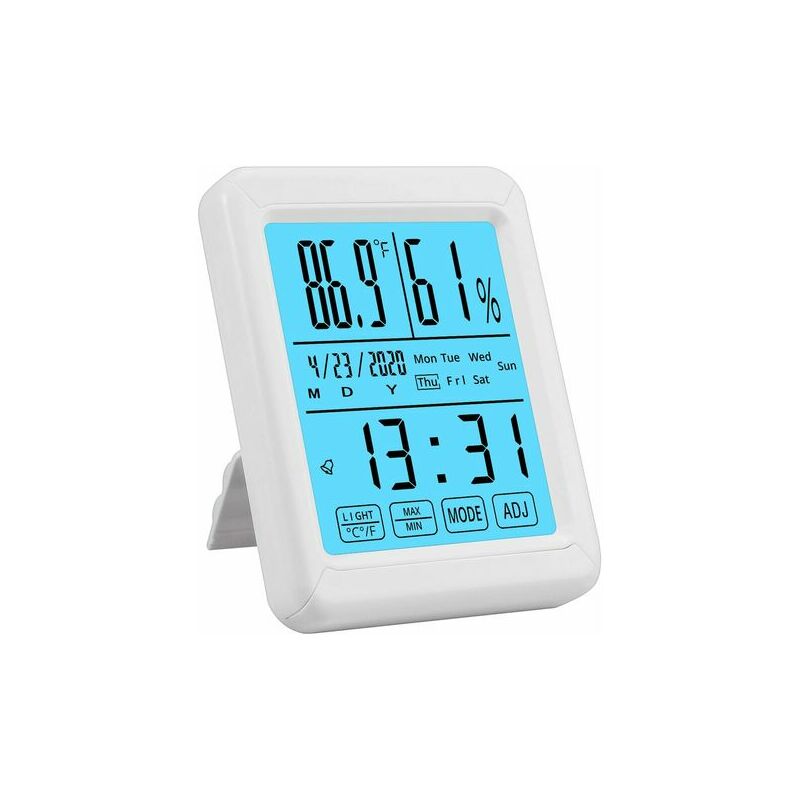 Intervallo di misurazione dell'umidità: 10% ~ 99% RH. Display retroilluminato: sull'ampio display a colori, tutti i valori sono chiaramente e facilmente leggibili utilizzando grandi numeri neri. Grazie all'illuminazione, lo schermo è facile da vedere anche al buio. Versatile: il termometro digitale può registrare automaticamente la temperatura e l'umidità massima e minima. È inoltre dotato delle funzioni data, settimana e orologio. Utilizza inoltre pulsanti completamente sensibili al tocco. Opzioni di montaggio multiple: supporto da tavolo per indicatore dell'idrometro, supporto a parete e magnetico: comoda funzione di montaggio per ogni tipo di stanza. Ampia applicazione: può può essere utilizzato in vari luoghi: ufficio, camera da letto, soggiorno, cameretta, cucina, asilo nido, magazzino, serra e altri luoghi. Specifica: Colore: bianco
