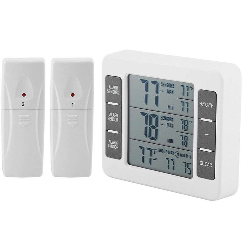 Descrizione: Questo è un termometro digitale wireless per congelatore. Può essere utilizzato nel congelatore e fungere anche da termometro interno ed esterno. Il suo allarme acustico può avvisarti in tempo della temperatura superata. Come installare: Il sensore è dotato di una clip caricata a molla insieme a un'impugnatura in plastica per fissarla saldamente al bordo di uno scaffale. Il display può essere montato su un frigorifero tramite calamita o utilizzare il foro integrato per il montaggio a parete. Nota: Non installare la batteria inversa. Non posizionare il ricevitore vicino al metallo. Evitare il trasmettitore direttamente sotto la pioggia. Specifica: Materiale: ABS Frequenza di aggiornamento: 10 secondi Intervallo di temperatura interna: 0℃-50℃ (32℉-122℉) < br />Intervallo di temperatura esterna: -40℃-60℃ (-40℉-140℉) Alimentazione: 2 batterie AAA per l'host (non incluse), 2 batterie AAA per l'host sensore (non incluso) Colore: bianco Dimensioni host: 10,0*8,5*2,0