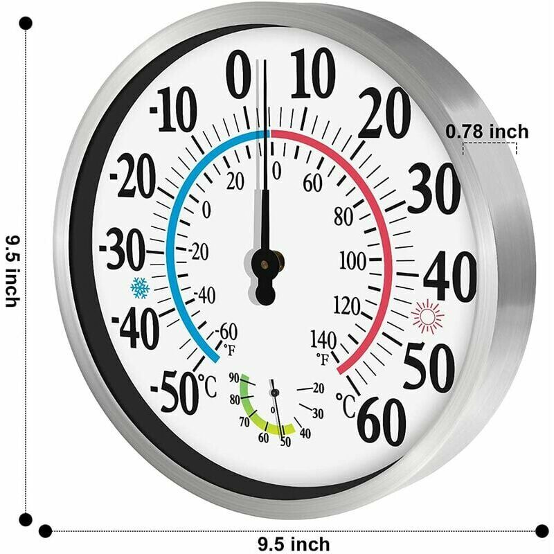 Intervallo di misurazione dell'umidità: 20~90% RH, Precisione: +/-7% RH (40~70% RH). il termometro esterno rotondo si adatta a tutti i cambiamenti generali di temperatura e umidità. Materiali durevoli: il termometro e igrometro esterno decorativo è costituito da un robusto alloggiamento inferiore in alluminio, una lente acrilica e un puntatore in alluminio, non arrugginisce come quelle metalliche. Puoi utilizzare questo grande termometro rotondo per lungo tempo senza danni anche se lo metti all'esterno. Facile da leggere: il nostro termometro per esterni ha un quadrante da 12 pollici, decorativo con un motivo blu e rosso sul quadrante superficie. E chiare linee di scala, numeri neri in grassetto per