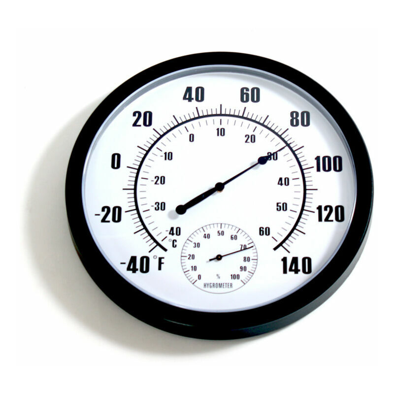 Grande termometro e igrometro (misurazione dell'umidità) per interni ed esterni da 10 pollici di diametro per monitorare le condizioni meteorologiche. Ampio display in resina trasparente per una facile lettura su lunghe distanze, senza batteria, non è necessario preoccuparsi del il prodotto arrugginirà. Intervallo di temperatura -40~60(2), gradi Celsius e Fahrenheit disponibili, intervallo di umidità 0-100% RH. Il termometro si autocalibrerà, dopo 2 ore, il puntatore corrisponderà automaticamente alla temperatura locale.