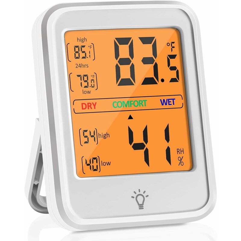 Pantalla retroiluminada - I nostri termometri e igrometri sono dotati di un sistema di rilevamento della luminosità tattile. Devi solo toccare il dito per due secondi per attivare la retroilluminazione gialla per 10 secondi, che attiverà e illuminerà lo schermo in condizioni di scarsa illuminazione. L'intervallo di misurazione è -20 ℃ ~ 70 ℃ (-4 ℉ ~ 158 ° ℉) e l'intervallo di umidità è 1% UR ~ 99% UR. 【Alta precisione e valore MAX e MIN】 Il termometro per l'umidità può contare i dati di misurazione in 24 ore. Il termometro igrometro digitale visualizza i dati di temperatura e umidità più alti e più bassi durante questo intervallo di tempo. Il termometro per interni è estremamente preciso, precisione dell'umidità ± 1%, precisione della temperatura: ± 0,5 . Questo lo rende un accessorio ideale per misurare la temperatura e l'umidità in una serra. 【Indicazione del livello di comfort】 L'indicatore di umidità indica il livello di comfort della casa. A seconda dell'umidità attuale e del