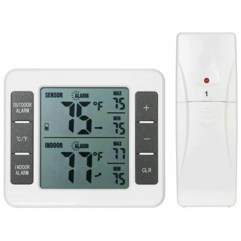 Il termometro digitale con sensore wireless è adatto per uso esterno o interno, ad es. B. soggiorno, camera da letto, baby room, ufficio, cantina, serra, cantina, ecc. - Monitoraggio di due temperature (una tramite termometro, una tramite sensore). Catturare i cambiamenti ambientali in tempo reale. Caratteristiche: DUE MONITOR DI TEMPERATURA: Realizzato in una solida custodia in ABS resistente, il termometro ha un sensore (distanza del segnale: 100 m) e può monitorare la temperatura di 2 luoghi contemporaneamente. ALTA PRECISIONE: Il termometro digitale, un sensore intelligente integrato, ha un ampio intervallo di misurazione della temperatura, monitoraggio preciso e velocità di aggiornamento di 10 secondi e fornisce gli ultimi cambiamenti ambientali. AMPIO DISPLAY LCD: L'ampio schermo mostra i valori dei dati di temperatura effettivi in un carattere grande che è facile da leggere, lo stato della batteria, l'icona dell'andamento della temperatura e la temperatura massima/minima.