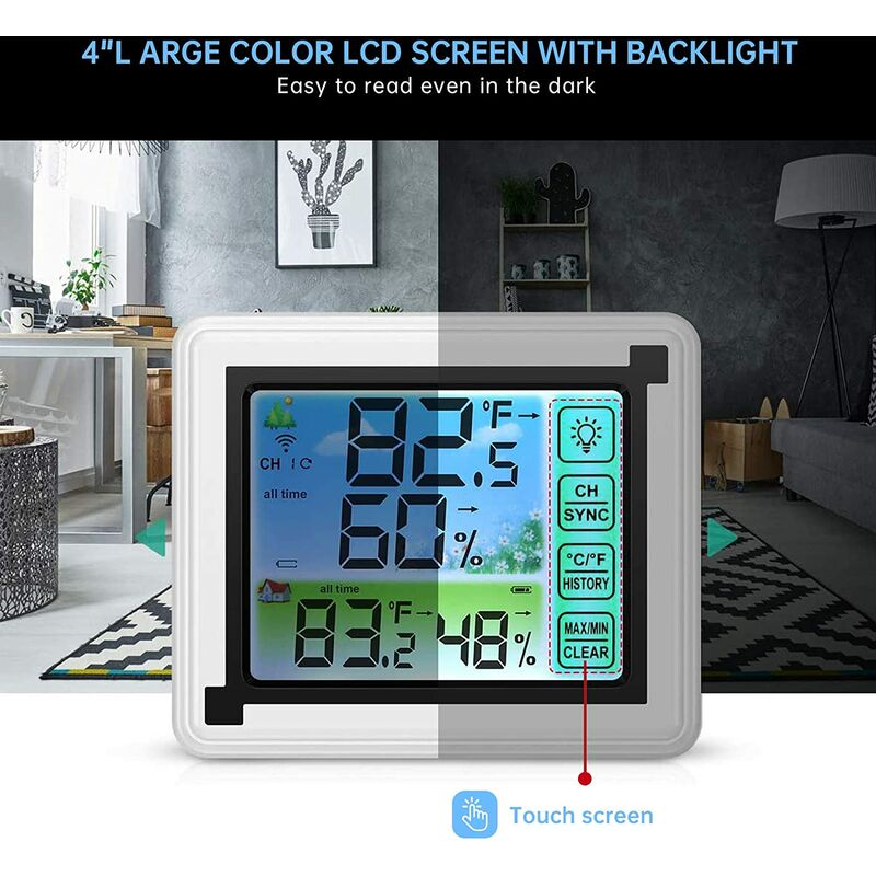 Schermo tattile e retroilluminazione - Il termometro digitale per ambienti con ampio display LCD da 4 pollici lo rende facile da leggere anche a lunga distanza. Dotato di touch screen e pulsante di retroilluminazione, il termometro igrometro è più comodo da maneggiare. 【Registrazione MAX/MIN】Il monitor dell'umidità registra automaticamente la temperatura massima e l'umidità min. L'icona della freccia vicino alla temperatura/umidità visualizzerà l'andamento della temperatura/umidità. 【Lettura accurata】 Il termometro per interni ed esterni fornisce letture accurate di umidità e temperatura interna ed esterna simultaneamente (accuratezza della temperatura: ±1,5°F / ±1°C;