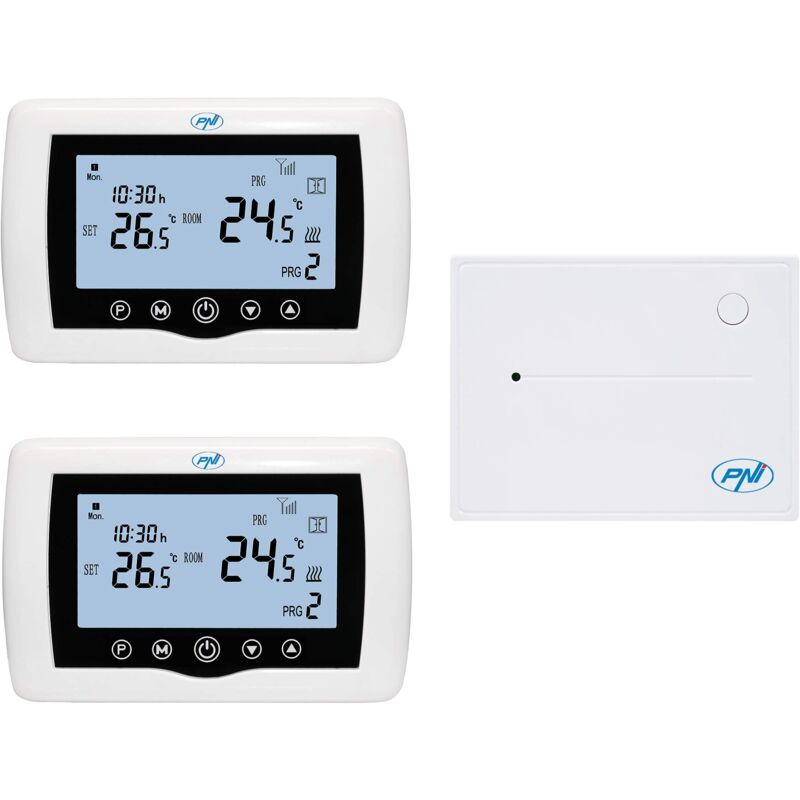 Dettagli tecnici Identificazione prodotto Codice prodotto PNI-CT400 Caratteristiche generali Tipo di prodotto Termostato wireless con controllo Internet Destinato a riscaldamento a pavimento, riscaldamento centralizzato Marchio compatibile universale Superficie di montaggio a parete Colore bianco Connettività: wireless al router, Wireless tra l'unità ricevente e l'unità trasmittente, Cablato alla caldaia Alimentazione Unità centrale: 2 batterie AAA Ricevitore: rete 230V Applicazione per smartphone Tuya Smart, Smart Life dedicata Funzioni, Controllo remoto della temperatura dall'applicazione mobile, Programma giornaliero: 4 fusi orari al giorno, Programma settimanale: lunedì, domenica, Controllo della temperatura locale, Unità centrale mobile, Rilevamento finestra aperta Parametri di funzionamento, Temperatura impostabile: 5, 35 C, Gradino di impostazione della temperatura desiderata: 0,5 C, Temperatura misurabile: 0-50 C, Unità di misura: Gradi Celsius, Sensibilità del sensore: ± 0,5