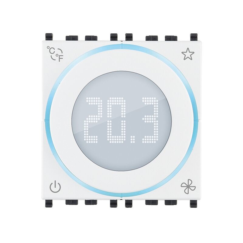 Vimar SKU: 02971.B EAN: 8007352668478 DESCRIZIONE PRODOTTO VIMAR 02971.B: Termostato per domotica a rotella per controllo della temperatura ambiente (riscaldamento e condizionamento), gestione impianti a 2 e 4 tubi, comando fan-coil a 3 velocità e proporzionale, dispositivo di controllo della temperatura di classe I (contributo 1%) in modalità ON/OFF, di classe IV (contributo 2%) in modalità PID, interfacciabile con attuatore con uscite analogiche proporzionali 01466.1 per realizzare un termostato d'ambiente modulante di classe V (contributo 3%), 1 ingresso per sensore elettronico di temperatura 20432, 19432 o 14432 o sensore di temperatura filare 02965.1, retroilluminazione a led bianca, bianco - 2 moduli. Da completare con placche Eikon, Arké, Plana. Per Idea installabile con supporto dedicato 16723 Gruppo: dispositivi di campo per registrazione ed elaborazione Classe: Termostato/Regolatore di temperatura ambiente Tipologia: altri Collegamento: a 2 fili Con ricevitore: No Sensore