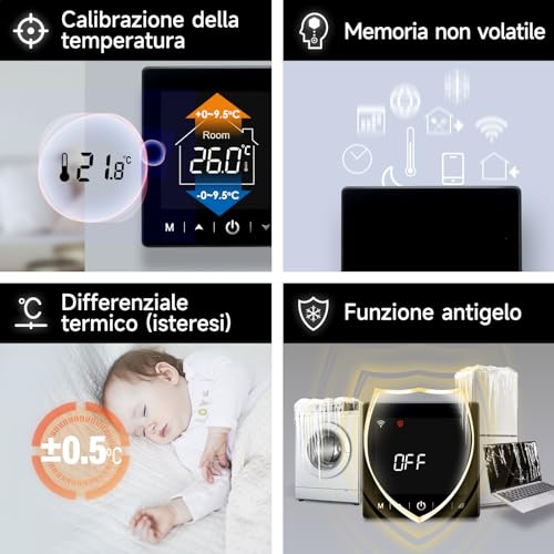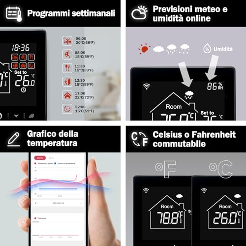 【Controllo vocale】 Il termostato è compatibile con ALXE e Google Assistant. È possibile accendere e spegnere il termostato tutte le volte che si vuole con la voce o con il cellulare.Anche quando il termostato non è con voi.È possibile chiedere ad Alexa la temperatura della casa o controllare la temperatura dal telefono, in modo da sapere qual è ora e cambiare la temperatura desiderata senza controllare il termostato
