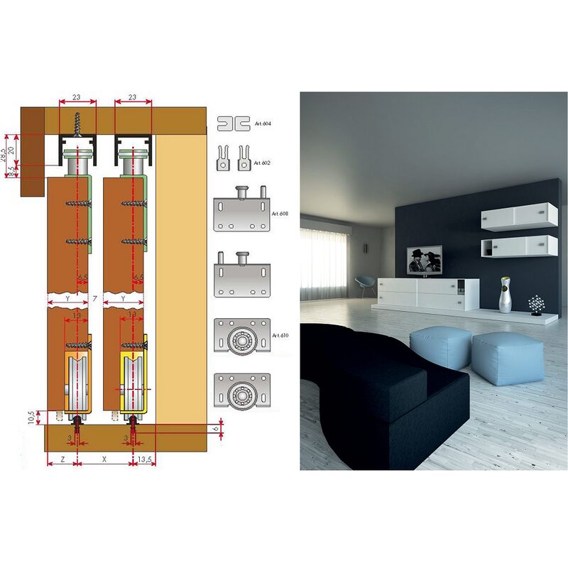 Kit modello Scorribase Standard per Ante Scorrevoli, marca Terno Scorrevoli Caratteristichetecniche: -Scorribase Standard è il più tradizionale dei sistemi scorrevoliregolabili per mobili con ante sovrapposte. -Portata massima: 60 kg. -Il sistema è caratterizzato da carrelli scorrevoli nella parte inferiore delmobile e da un pratico sistema di aggancio nella parte superiore. -Fermi Standard Per un kit completo per1 anta acquistare: -TSC608610- Scorribase standard -TSC660G3- Binario superiore in Alluminio -TSC620G3- Binario inferiore alluminio (Con Fresatura) In altrernativa al binario inferiore in Alluminio con Fresatura è possibile inserire: -SLI1004502A3- Profilo inferiore alluminio (Montaggio in Esterno con Viti) La confezione comprende: -nr.01 Kit modello Scorribase Standard Perché scegliere Terno Scorrevoli? Terno Scorrevoli è una realtà in continuaevoluzione. Questa caratteristica si ritrova non solo nei prodotti Terno,sempre all'avanguardia, ma anche negli spazi dell'azienda