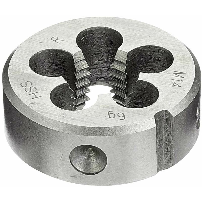 Trafile in acciaio super rapido di qualità. Per filettatura maschio metrica (DIN ISO 13). Questo robusto strumento è adatto a tutti i comuni materiali industriali, come: acciai non legati e bassolegati con resistenza fino a 800 N / mm2, ghisa malleabile e metalli non ferrosi. Diametro bullone 13,82 mm Per tagliare una filettatura esterna, il pezzo deve già avere un diametro nominale della filettatura desiderata. Il pezzo da lavorare deve essere bloccato in una morsa con il lato da tagliare rivolto verso l'alto. Lo stampo viene applicato e ruotato fino a raggiungere la lunghezza del filetto desiderata. Si consiglia di invertire leggermente lo stampo ogni tanto in modo che i trucioli si rompano, cadano e non ostruiscano i fili. Si consiglia la lubrificazione con olio da taglio. Ciò riduce lo sforzo e aumenta la durata (durata) dello stampo. Caratteristiche: Tipo: Forma B chiusa, pre-tagliata Filettatura: M 14 metrica DIN ISO 13 Passo filettatura: 2,00 mm Tolleranza: ISO 6 grammi