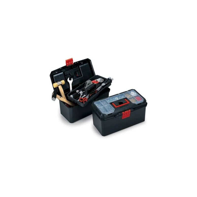 Portautensili modello tool case 16 in resina termoplastica, maniglia a scomparsa. Vassoio interno estraibile. Scomparti portaminuterie sul coperchio. Dimensioni mm 40 x 21 x 175 altezza cm
