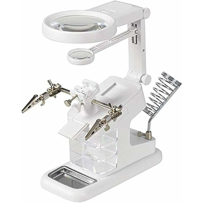 Lenti in PVC illuminate 3X da 3 pollici con lente ausiliaria 4,5X e 25X Il collo girevole a 360 gradi e le braccia girevoli consentono di regolare l'obiettivo nella posizione in cui ne hai più bisogno. Luci LED ultra luminose: 10 Super luminose, energia LED efficienti. Alimentazione tramite cavo USB (incluso) o 3 batterie AAA (non incluse).Bracci completamente regolabili: 2 lancette completamente regolabili con clip a coccodrillo, supporto in ferro, vassoio in metallo, tre contenitori e base aggiornata.Applicazioni versatili: workstation perfetta per saldatura, costruzione modellini, riparazione elettronica, progetti fai da te, hobby e artigianato.
