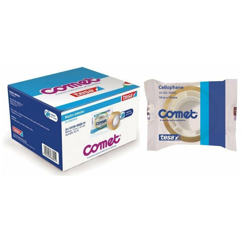 Nastro adesivo comet misura 10mx19mm - espositore da 40 pezzi ATTENZIONE: SE IN FOTO O NEL TITOLO VIENE VISUALIZZATO UN ASSORTIMENTO O ESPOSITORE, IL PREZZO FA RIFERIMENTO AL SINGOLO PEZZO E NON ALLA CONFEZIONE. NOTA SUI TEMPI DI EVASIONE E SPEDIZIONE: ACQUISTANDO QUESTO PRODOTTO I TEMPI DI GESTIONE POSSONO ARRIVARE FINO A 10 GIORNI LAVORATIVI.